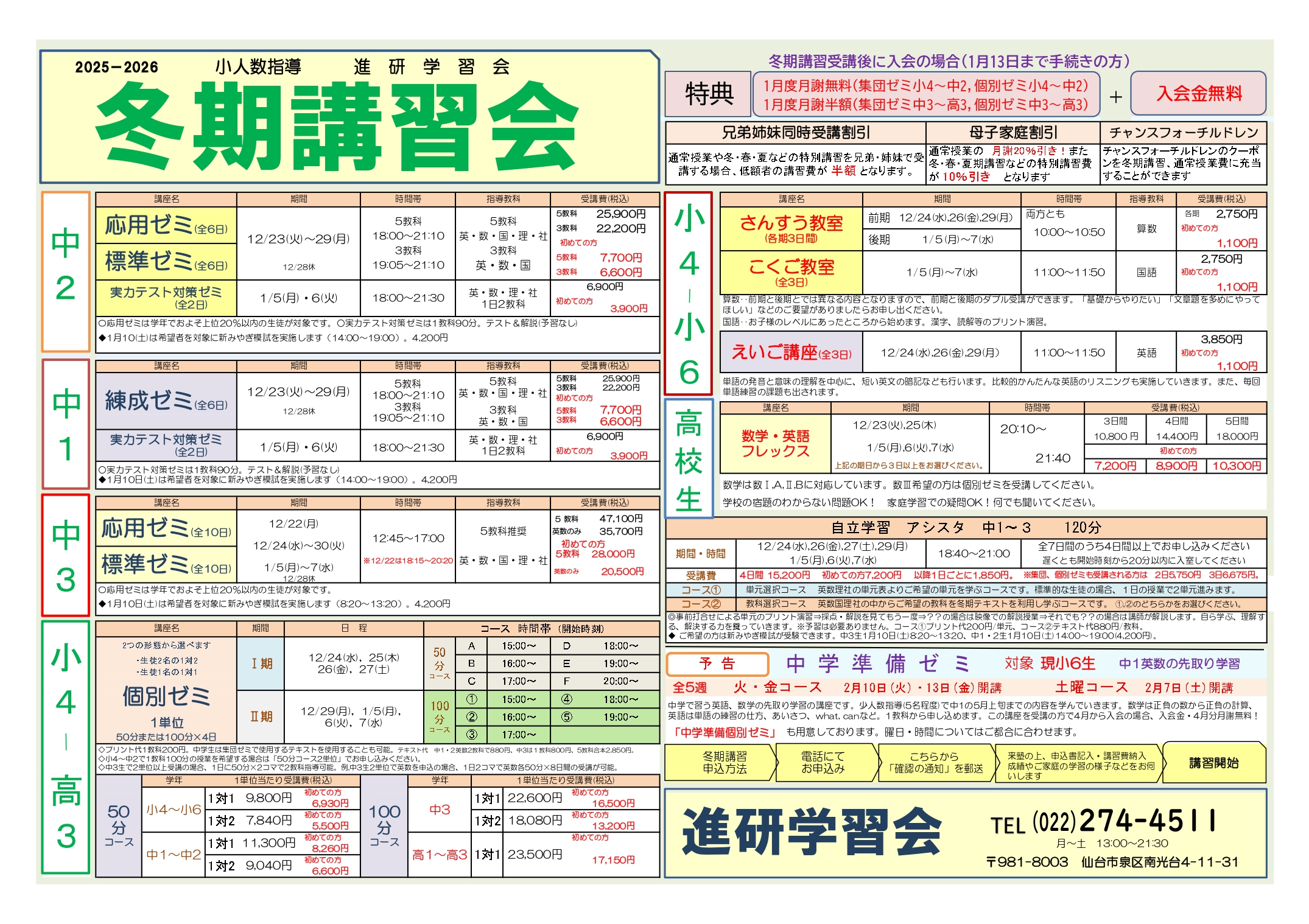冬期講習の案内です。コチラをご覧ください。集団ゼミ、個別ゼミ、自立学習アシスタなどお子様に合う講座をご受講ください。