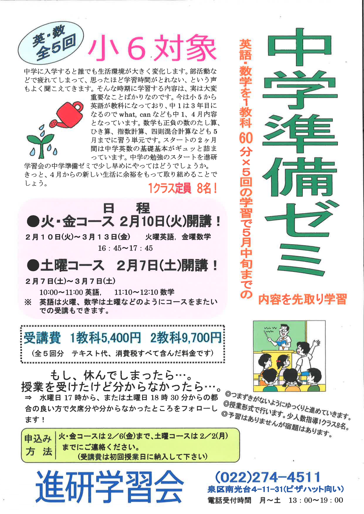 オープンゼミですのでどなたでも受講できます中学で習う英語、数学を先取りする講座です。少人数指導で中1の5月上旬までの内容を